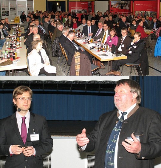 Rund 200 Interessierte besuchten die Informationsveranstaltung in der Kulturhalle Ziegenhain (Foto oben). Die beiden Referenten zum Thema Stromspeicher und Bürgerwindpark (v.l.): Dr. Johannes Kostka von der Robert Bosch AG und Jan Martin Hansen vom Bürgerwindpark Braderup Ost GmbH & CO. KG (Foto unten).